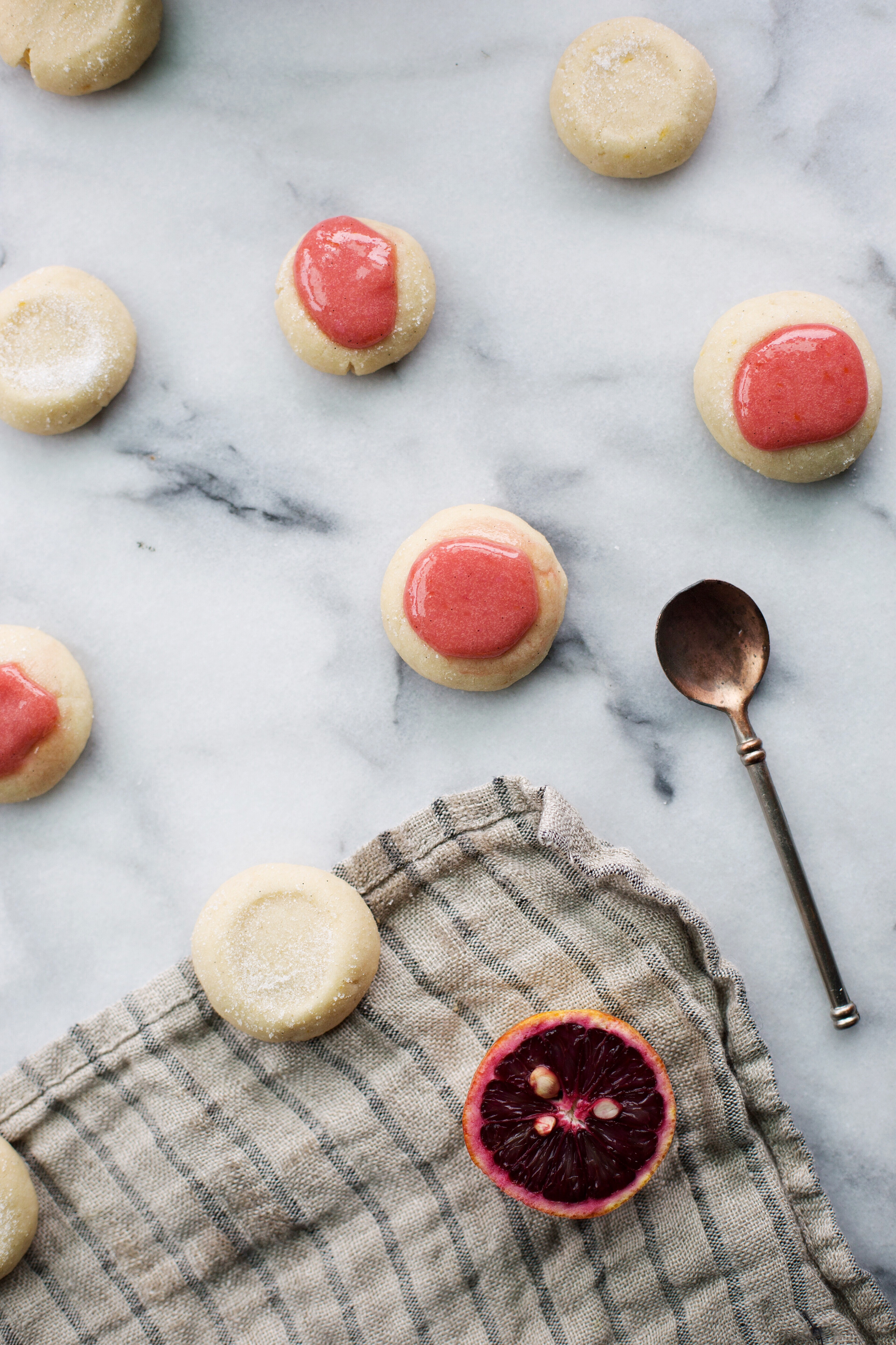 I know, I know, more shortbread. I think I’ve mentioned this before but (besides my mom’s famous chocolate chip cookies) I’m not often tempted by cookies in general, especially not if there’s cake around. But shortbread…buttery, crumbly shortbread…it gets me every time. Please feel free to substitute your favorite thumbprint cookie recipe in its place, but Bouchon’s shortbread recipe works beautifully here. If you are looking for something to do with the leftover curd you could use it in place of the grapefruit curd in this cake. I also made some changes to my usual shortbread recipe, adding some lemon extract, zest and a little vanilla salt.